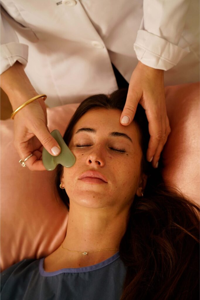 Facial Gua Sha uses a smooth stone tool to gently massage the skin, increasing circulation and promoting lymphatic drainage. This helps reduce puffiness, brighten the complexion, and release facial tension.